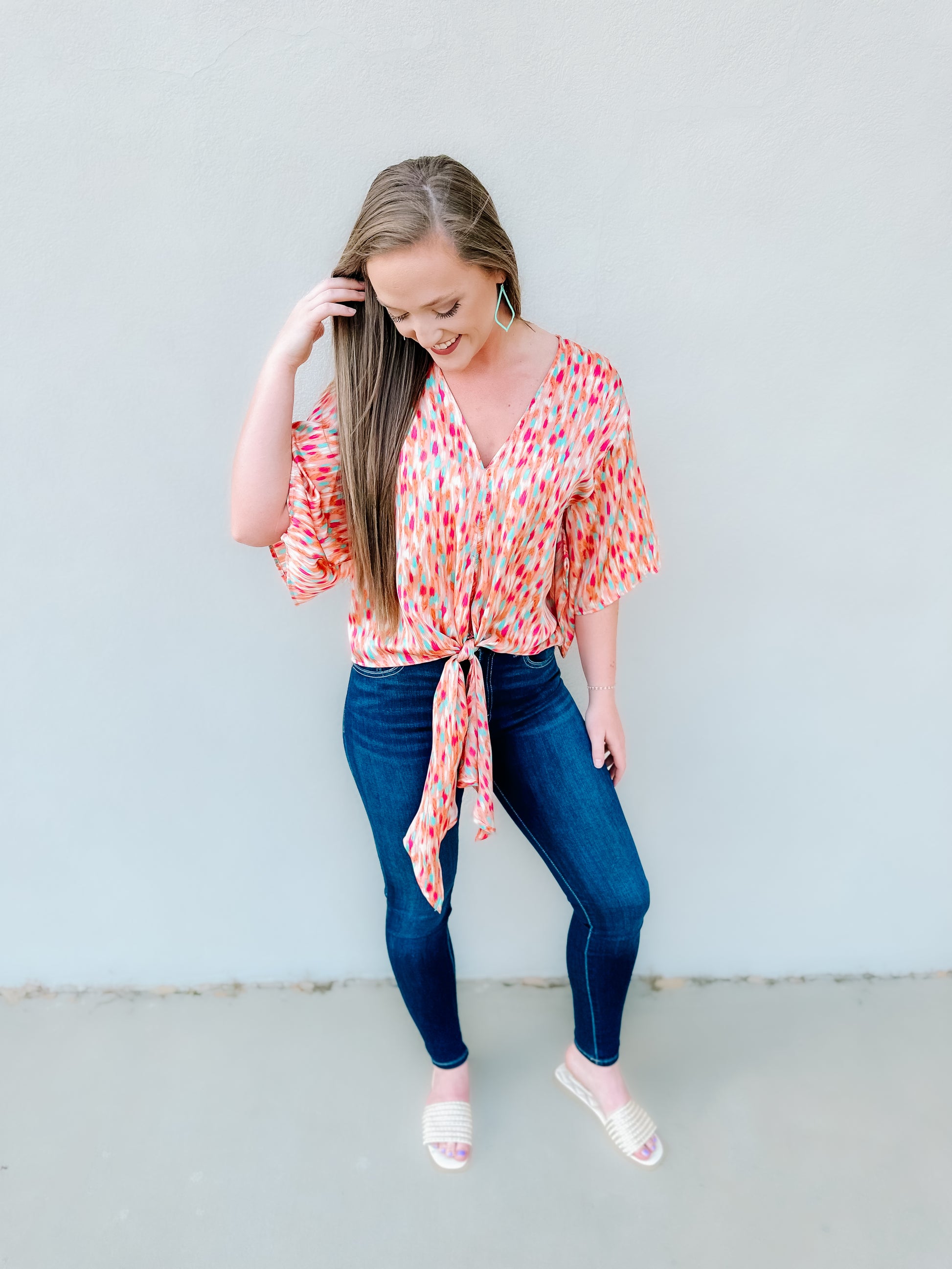 Be cute and chic in our favorite Adrienne top! Lightweight and flowy for the most comfortable yet flattering fit! This blouse features an abstract painted print, v-neckline, tie front and 1/2 sleeves for the perfect spring transition top!