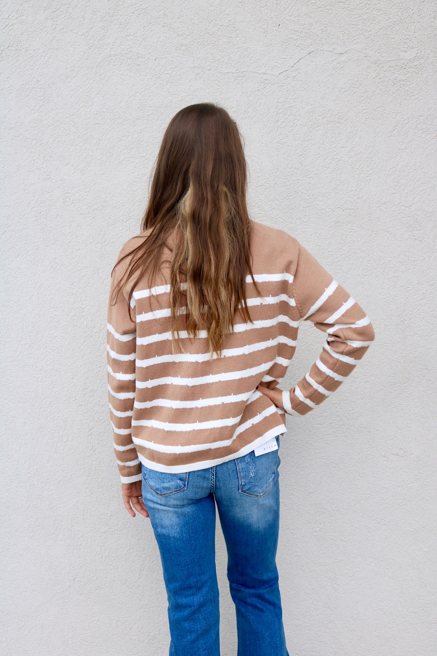 This Allison Striped Sweater features a timeless tan and white striped pattern, providing a fashionable yet classic look. Designed with a cozy high neckline, it's perfect for staying warm during the fall season. Expertly crafted for both style and comfort, this sweater is a must-have for any wardrobe.