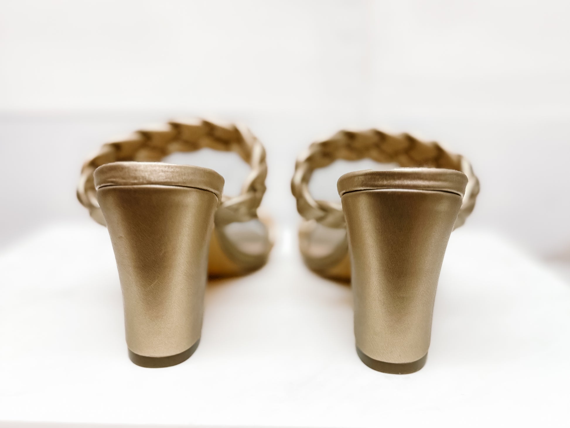 Gold braided two strap heels that are stunning for every occasion! Pairs beautifully with our new spring/summer dresses and business wear! Heel is approximately 3.5 inches.