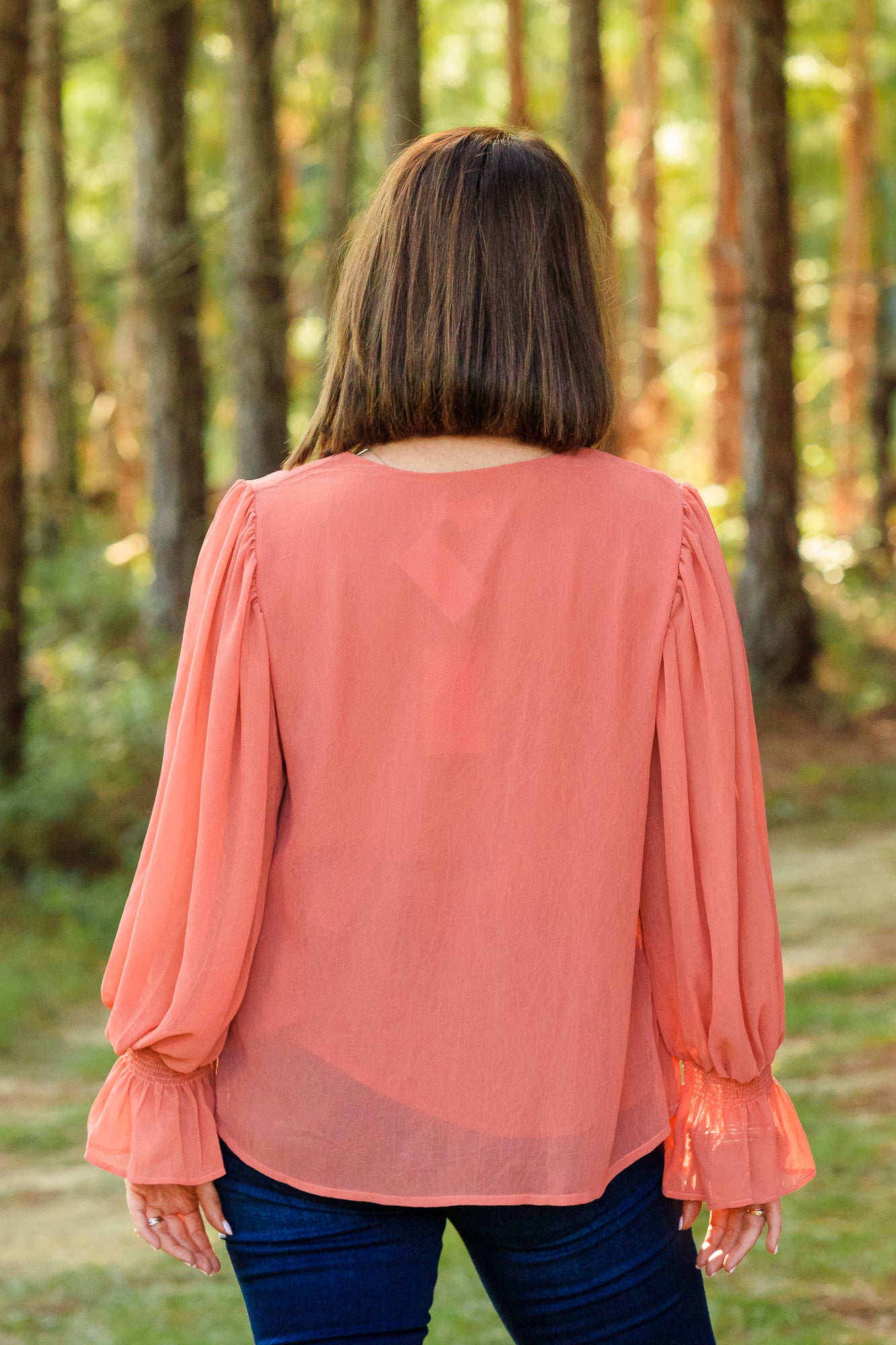 Long sleeve, v-neckline top. Elastic at wrists with ruffle detail. Fully lined.