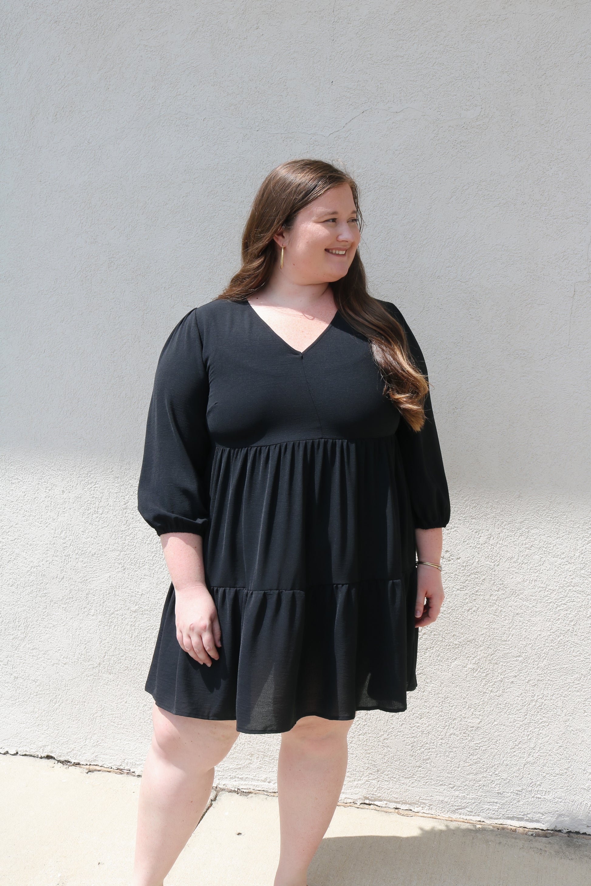 The Curvy Elaine Dress is an on-trend classic! Featuring a stunning above the knee length, v-neckline, two tiered skirt, and 3/4 sleeve.