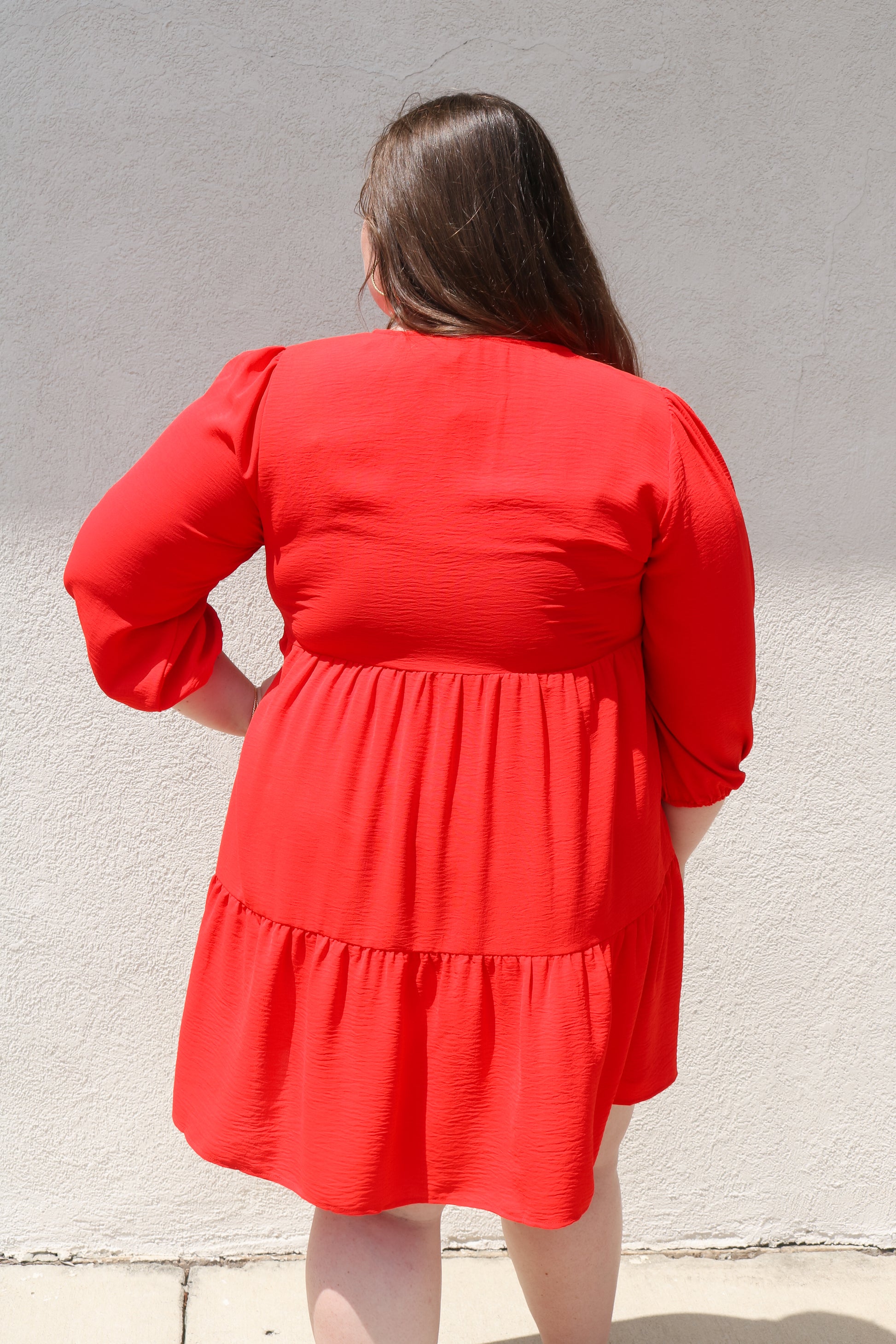 The Curvy Elaine Dress is an on-trend classic! Featuring a stunning above the knee length, v-neckline, two tiered skirt, and 3/4 sleeve.