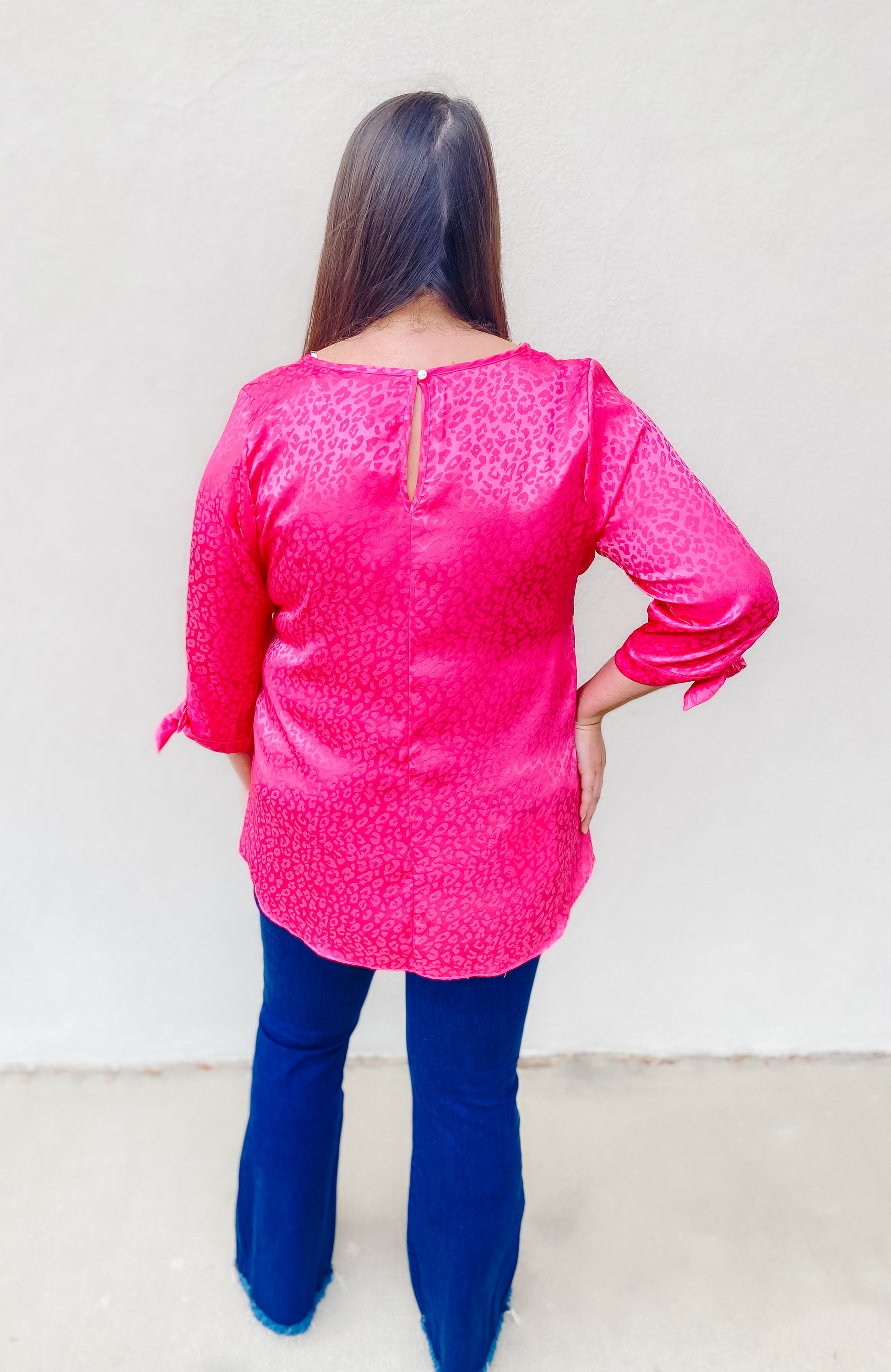 The Curvy Elise Top makes for the best spring/summer transition top! Featuring 3/4 tie sleeves, a round neckline, and a subtle leopard print. Bright pink tones will be your favorite staple this season! Pairs beautifully with our Linda Sandals in Fuchsia or Gold!