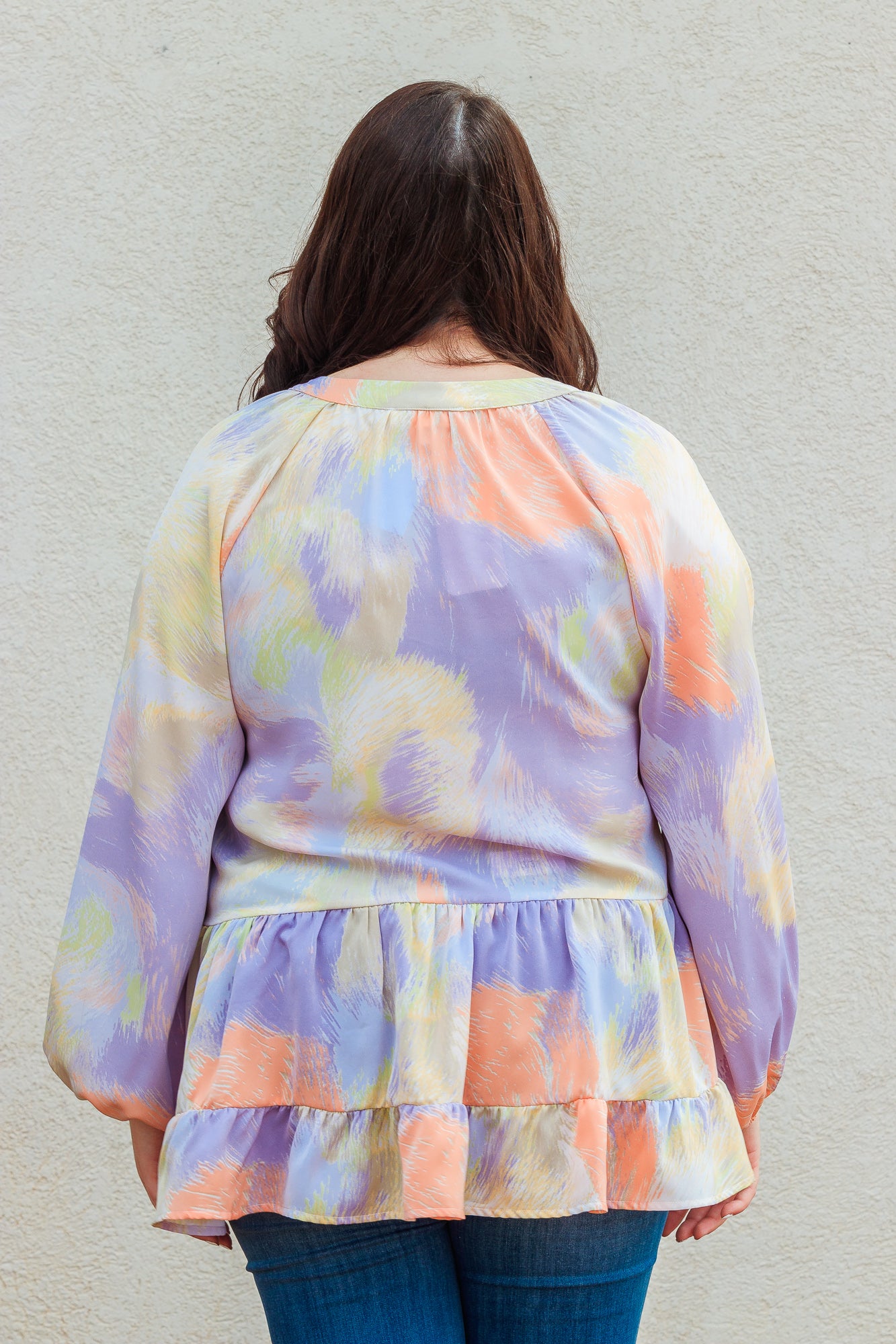 Printed v-neck long sleeve top featuring tiering detail. Unlined. Woven. Non-sheer. Lightweight.