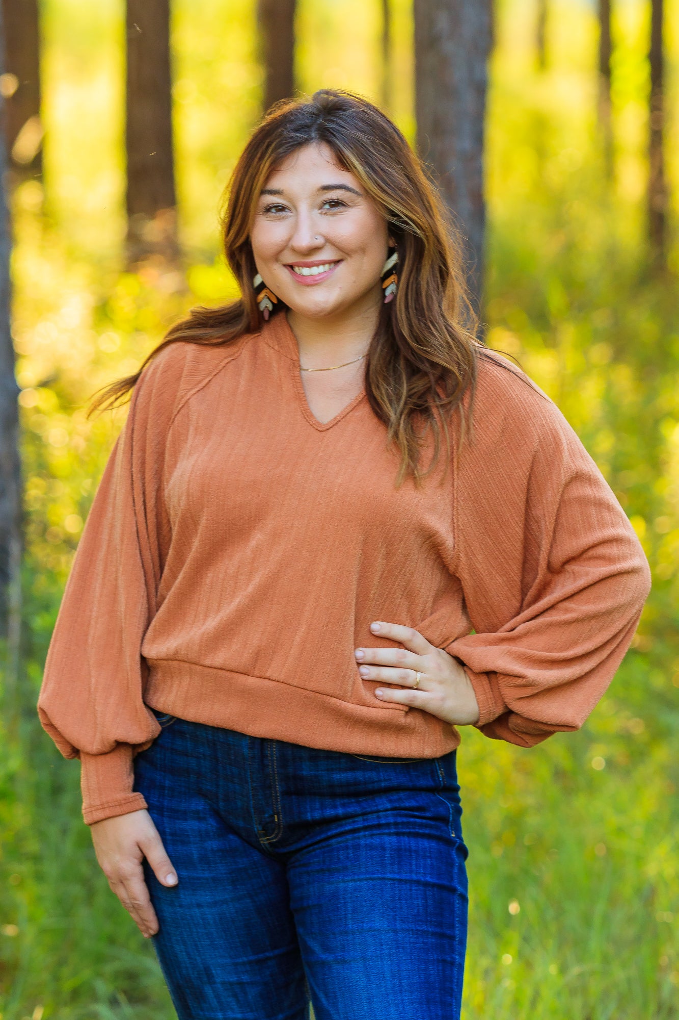 The Lexi Top is long sleeved with a V neckline. It is SO soft and PERFECT for the Fall weather! It is 95% Polyester and 5% Spandex. We suggest to wash in cold water, and lay flat to dry.