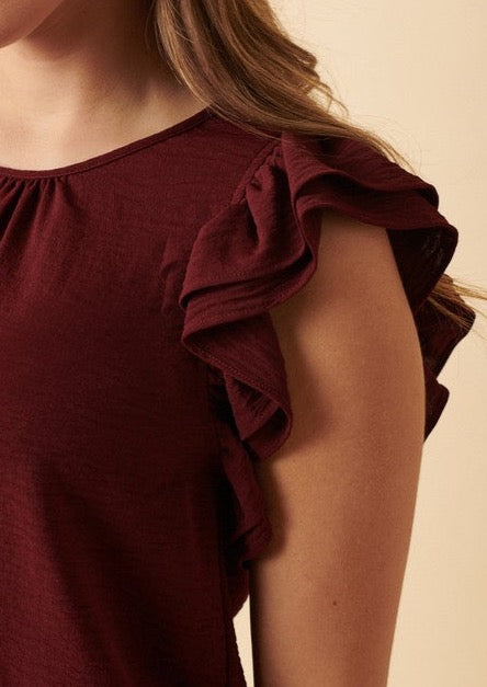 The Wesley Top is a basic burgundy top! It has short sleeves with a ruffle detail. It has a round neckline. The Wesley Top is perfect for adding a shacket or cardigan over! It is 100% Polyester. We suggest to wash in cold water, and lay flat to dry.