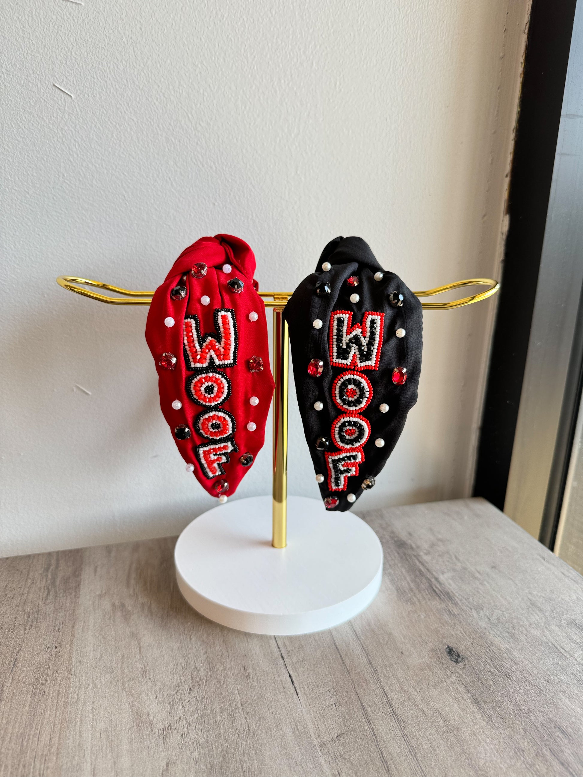 Enhance your style with the Woof Beaded Headband. Featuring a stunning beaded woof design, adorned with faux diamonds, this headband adds a touch of glamour to any outfit. The vibrant red and black colors make it versatile and perfect for any occasion. Elevate your look with this must-have accessory.